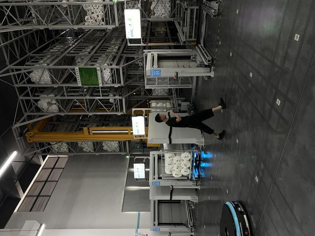 周以宁领着一众参观人员,从一楼的仓库到二楼和三楼的生产车间,熟练地为参观人员讲解。在一楼仓库区,周以宁偶尔会提醒参观人员,小心地面上正在忙碌工作的AGV搬运机器人。《中国经营报》记者看到,在这间大型的仓库区域,来回穿梭的AGV搬运机器人“背”着装满布匹的高大货架,有条不紊地负责着布料的入库与出库搬运工作,有些将仓库门口卸下的货搬运存放到十几米高的立体仓库中,有些将货从立体仓库搬运到待生产区。如果遇到障碍物,这些AGV搬运机器人会自动躲闪和继续快速执行指令。